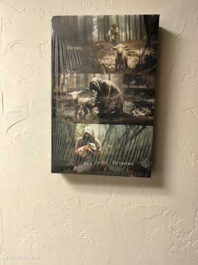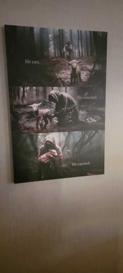 Really dig the combination of the large pic (Jesus running to the rescue of the clueless lamb), & the 3 small canvases of scripture.